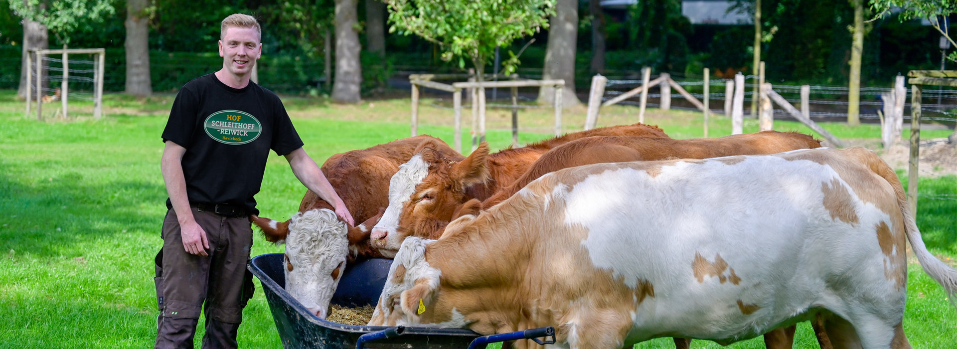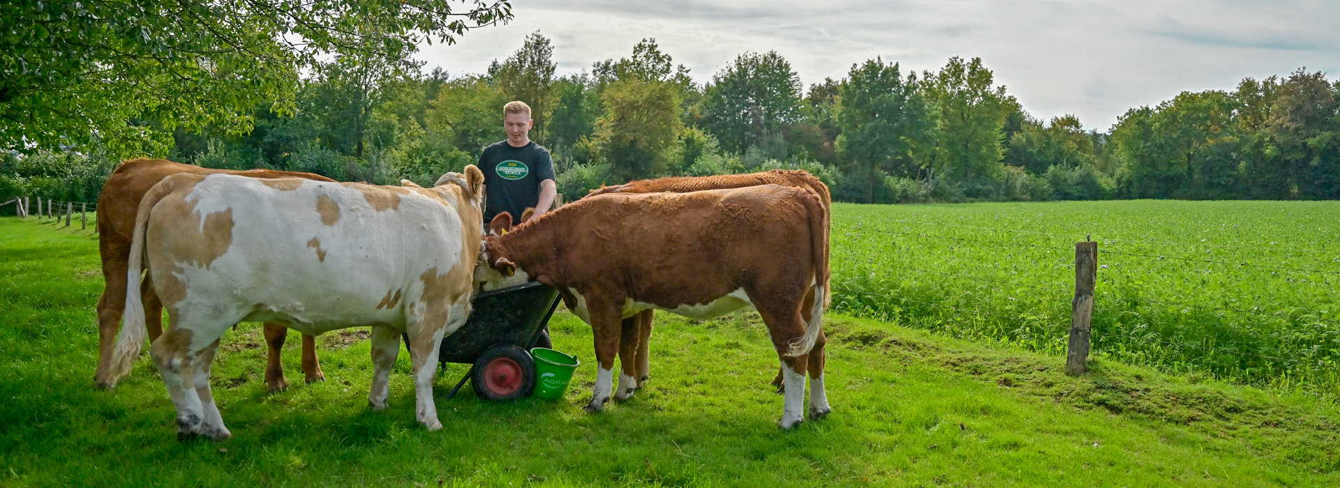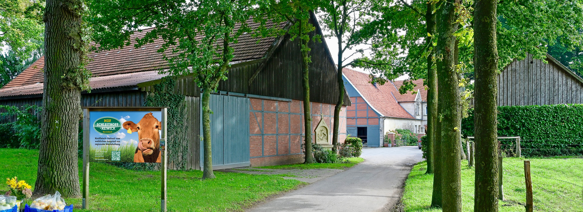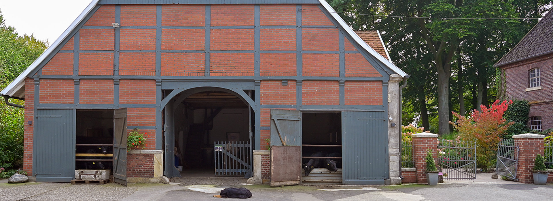 Wir bewirtschaften unseren Familienhof in den Baumbergen im Nebenerwerb. 1992 haben wir unseren Hof in Havixbeck auf reine Bullenmast umgestellt. Seit 2022 laufen eigene Färsen* (weibliche Jungrinder) den Sommer über in unserer Weide. Auf unseren Feldern produzieren wir für die Tiere Weizen, Gerste, Mais und Gras.